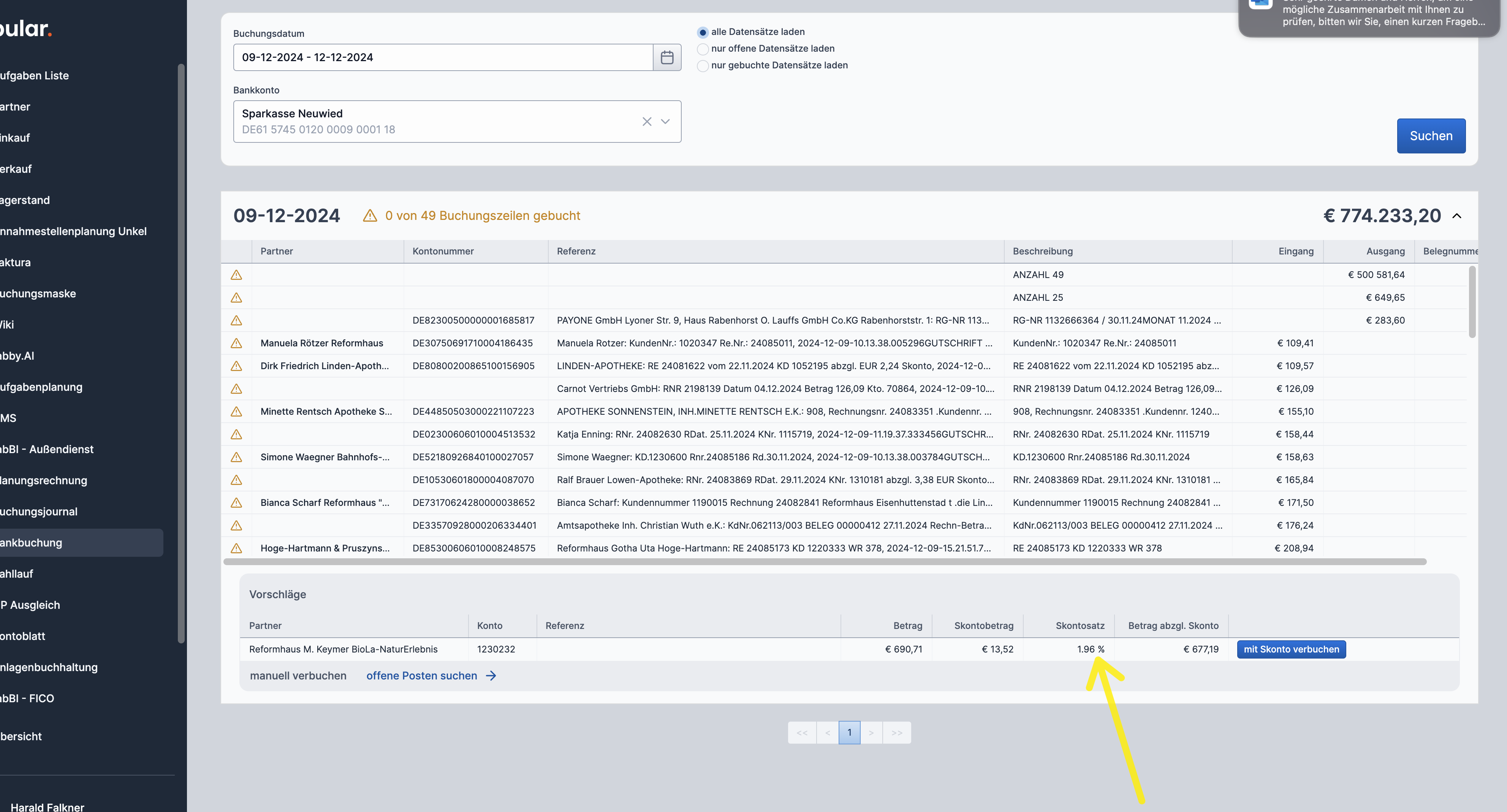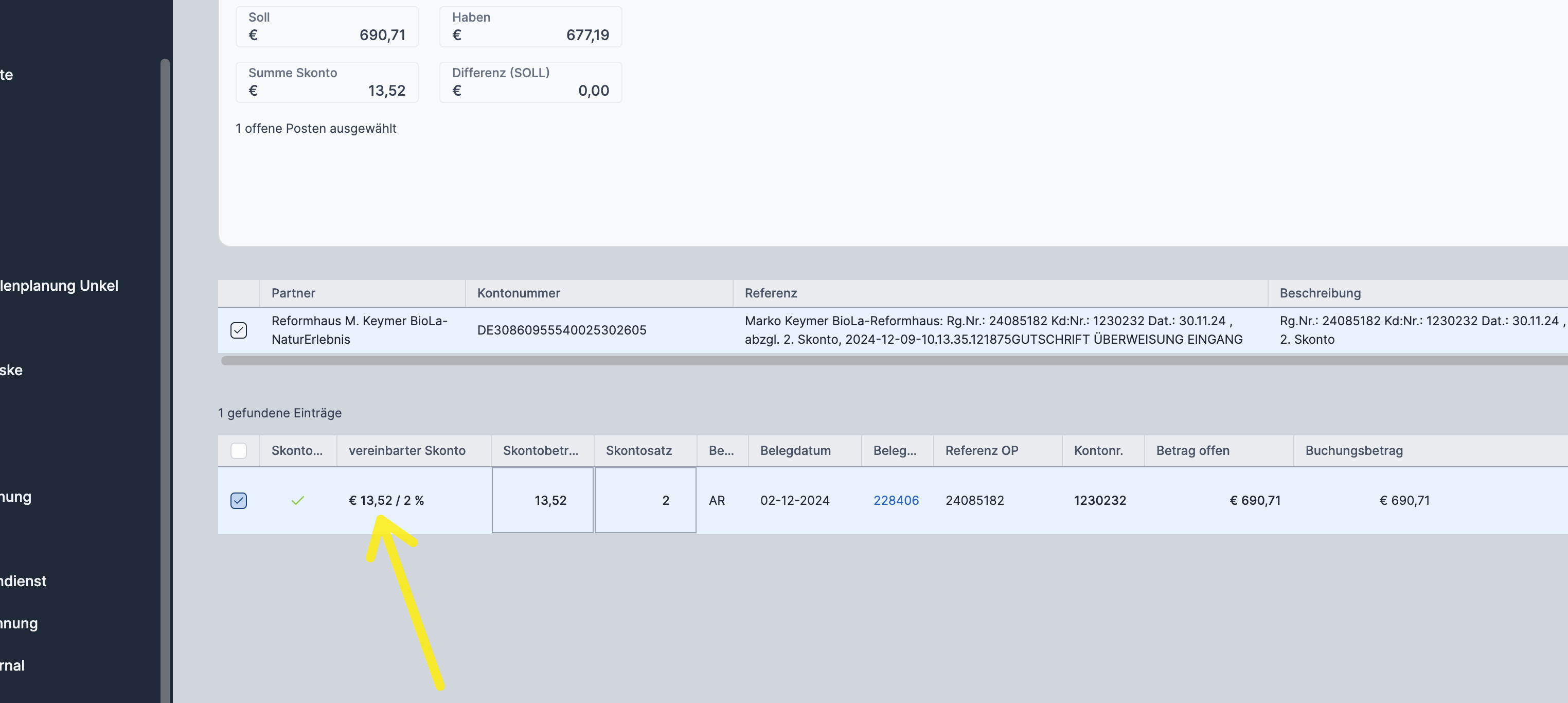 Die Anzeige des Skontos in der Schnellanzeige funktioniert offensichtlich anders als im Detail: