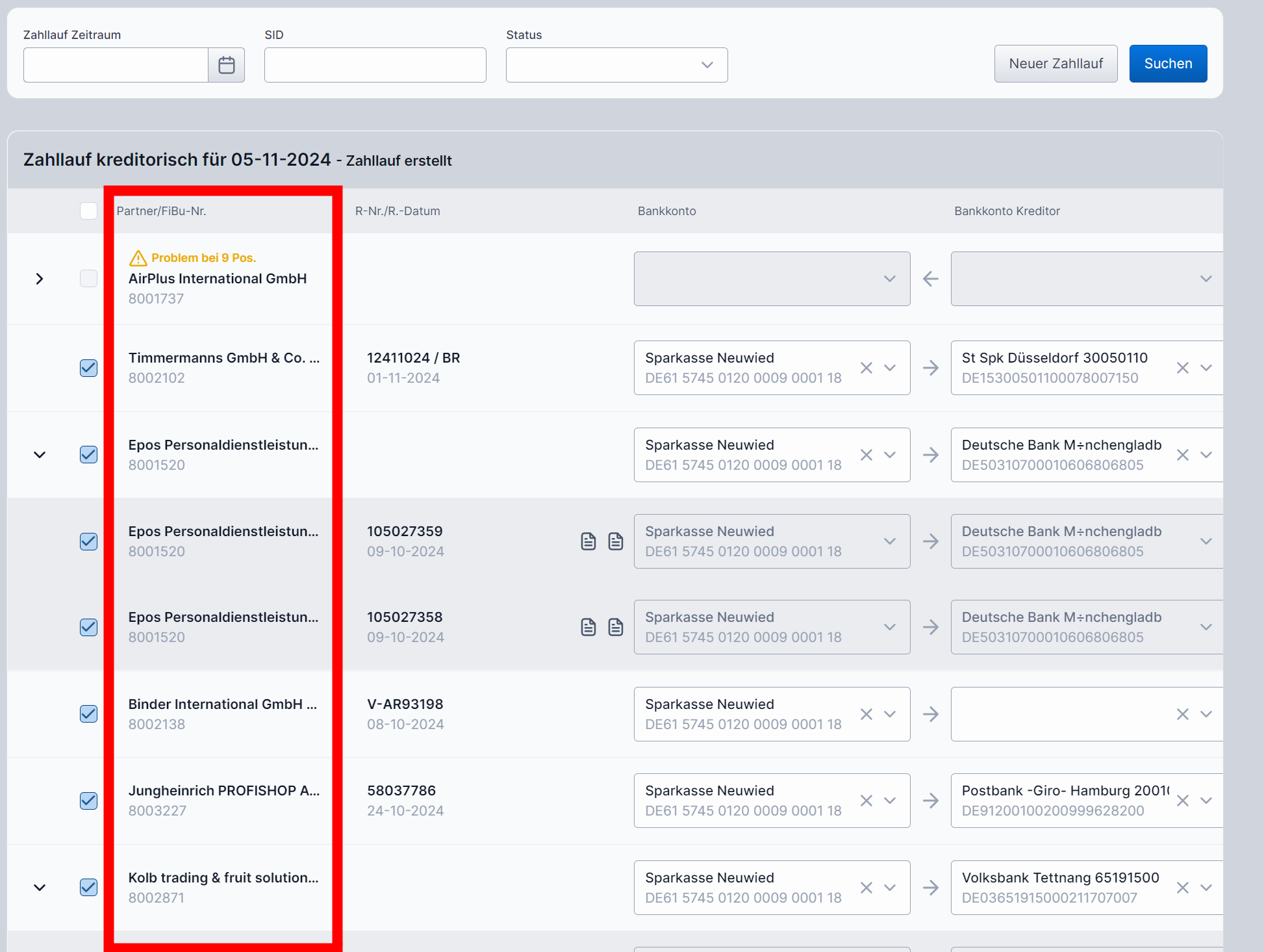 Aktuell kann nach dem Partner, Rechnungsbetrag und Überweisungsbetrag sortiert werden.