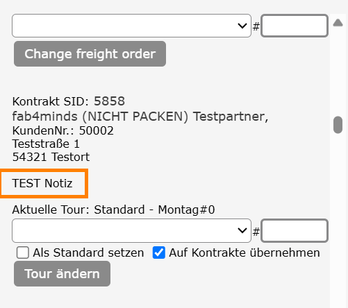 In der Kachel der Karten-Tourenplanung wird nun der Tourenhinweis (aus [CrmAdressTour.remarkGeneral]) direkt unter der Adresse angezeigt. Dies sorgt für eine bessere Übersicht und stellt zusätzliche Informationen direkt in der Planung bereit.