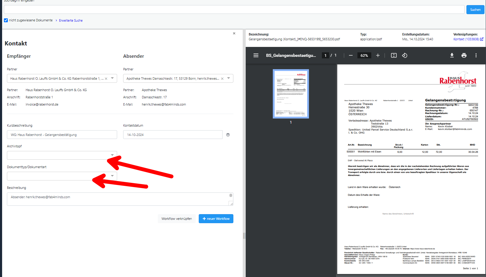 Archivtop und Dokumenttyp/Dokumentart werden zwingend angezeigt. Kontakt/Fragebogen lässt sich auch nicht speichern, wenn diese Felder nicht angegeben sind.