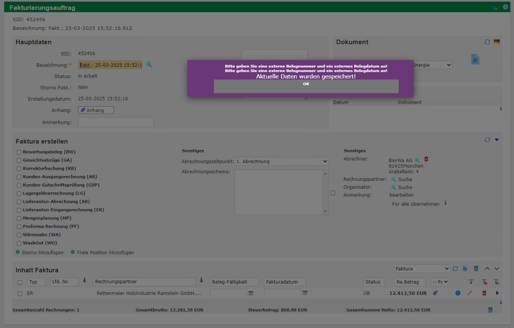 Wenn bei einem Abrechnungsschema eingestellt ist, dass automatisch 2 Mal gespeichert wird und ein Validierer beim Speichern anschlägt, wird die Meldung aus dem Validierer doppelt angezeigt. Der Validierer (Abfrage SID 5759) selbst liefert die Warnung nur einmal zurück. Bitte die Ausgabe der Meldung aus dem Validierer so anpassen, dass sie nur einmal angezeigt wird.Beispiel am BayWa Energie DEV-System: Fakt.Auftrag SID 452456
