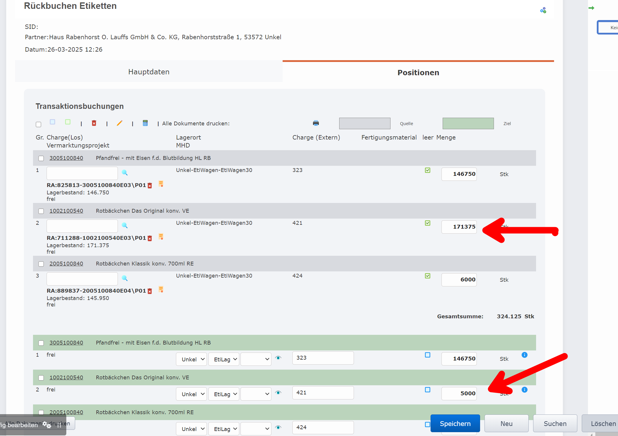 Bei der Rückbuchung der Etiketten bei Rabenhorst funktioniert der Mengen abgleich auf Sortnr. Ebene nicht.