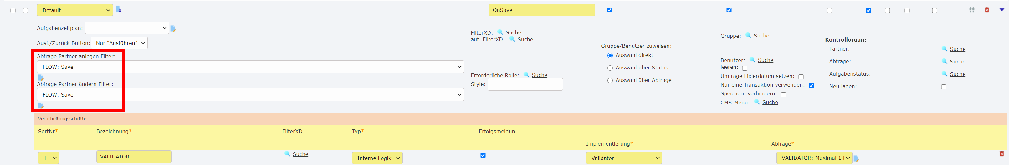Dadurch können gemeinsam mit dem Häkchen \"Nur eine Transaktion verwenden\" 1 Flow manuell und 1 Flow als onSave ausgeführt werden, und beide Flows durch einen Validator im onSave Flow zurückgerollt werden.