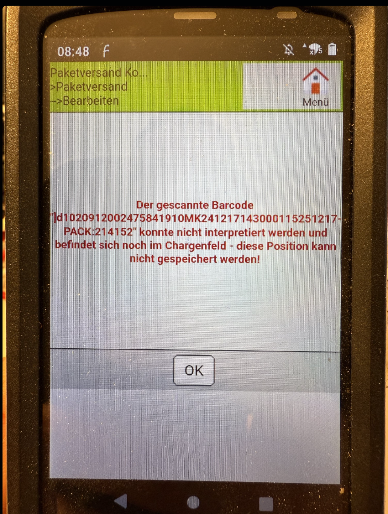 Scannerfehlermeldung: Charge kann nicht interpretiert werden