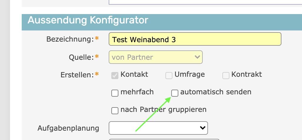 Wenn eine Aufgabenplanung bei einer Kampagnenaktivität hinterlegt wird, soll \"automatisch senden\" angehakt werden.