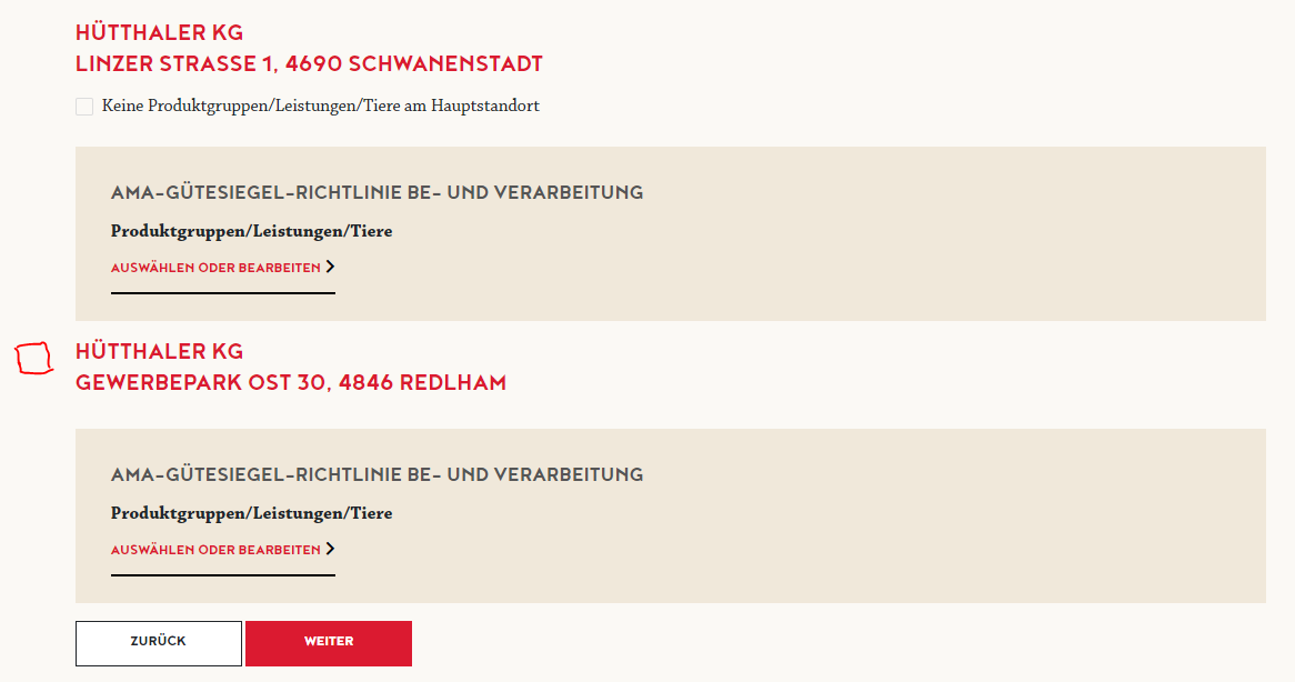 Für die angehakten Betriebsstätten muss dann eine Produktgruppe ausgewählt werden. Der Hauptbetrieb ist natürlich fix, da gibt es nur die bereits bestehende Möglichkeit mit dem Hakerl bei \"Keine Produktgruppen/Tiere/Leistungen\".