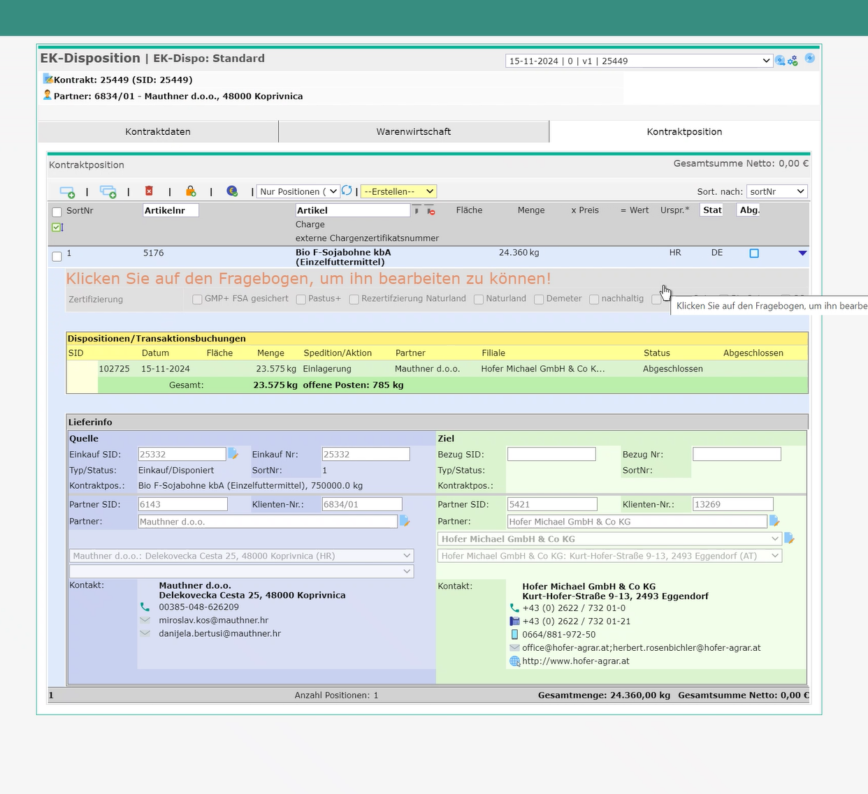 Im BSM soll unter EK Dispo auf dem Artikel Soja pro Landwirt eine Sorgfaltspflichtnummer angegeben werden.