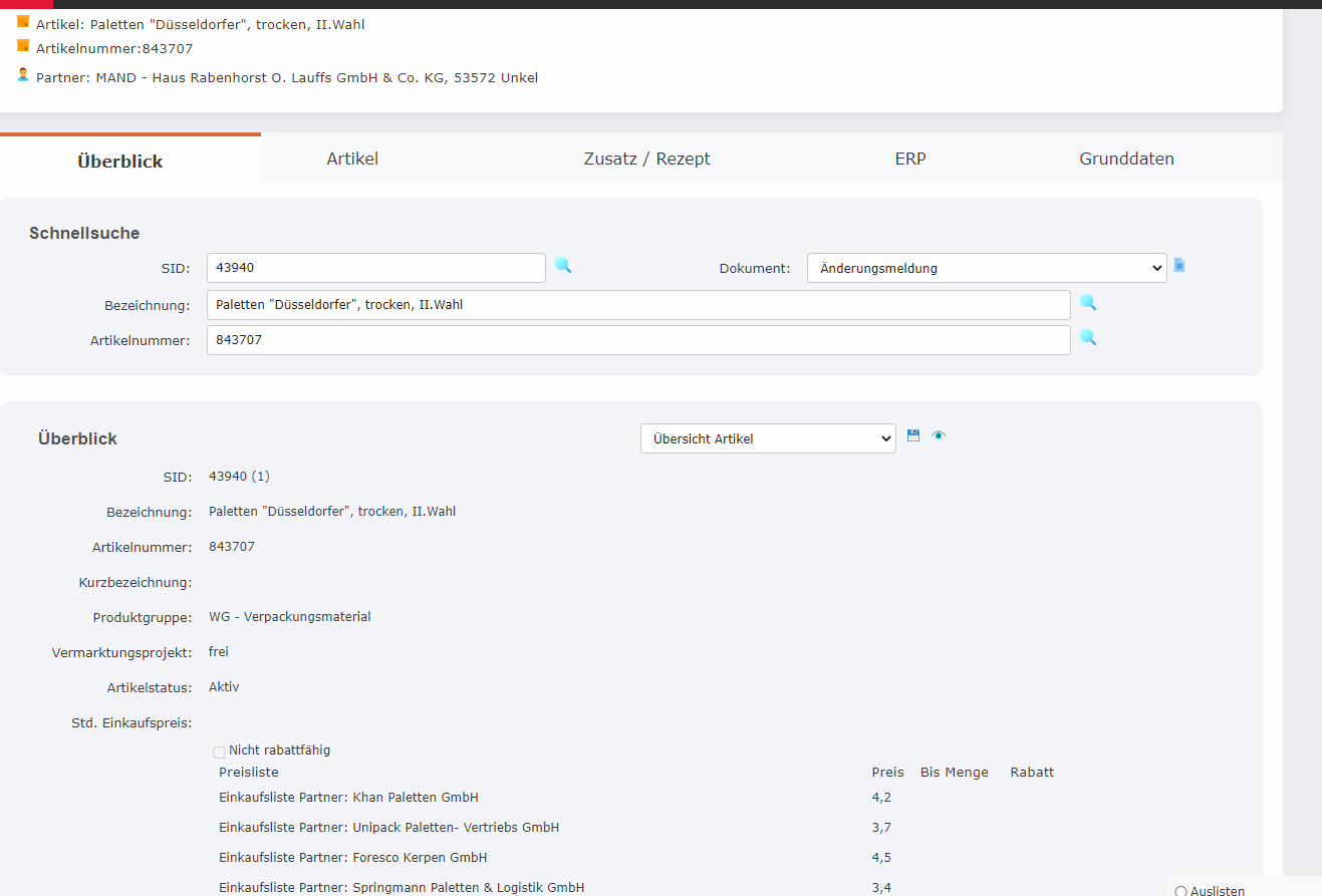 Wir haben den Artikel - Paletten Düsseldorfer. Dieser gehört kostentechnisch immer auf 2 Kostenstellen aufgeteilt.