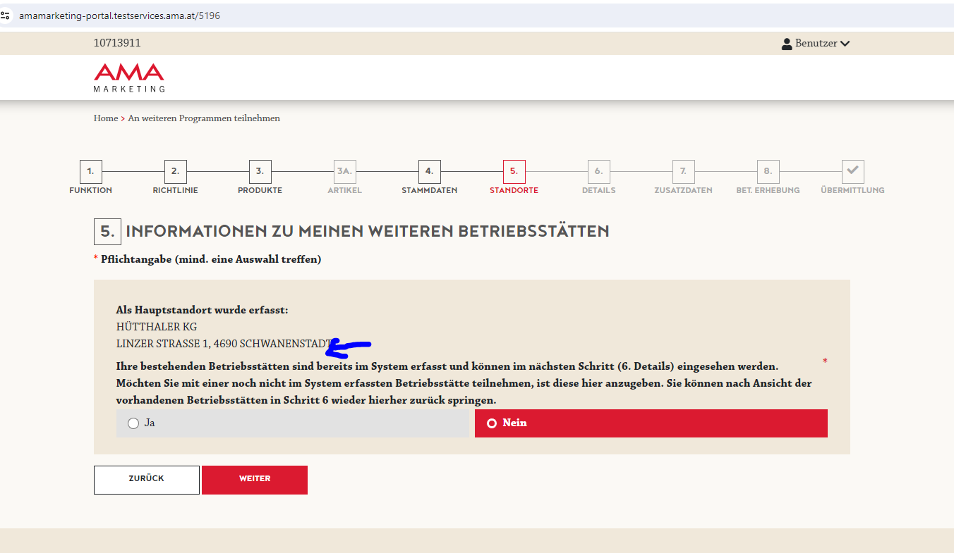 Portal: Anzeige der bestehender Betriebsstätten in Reg. Schritt 5