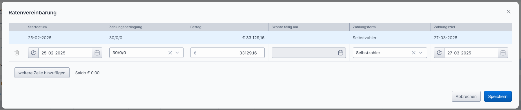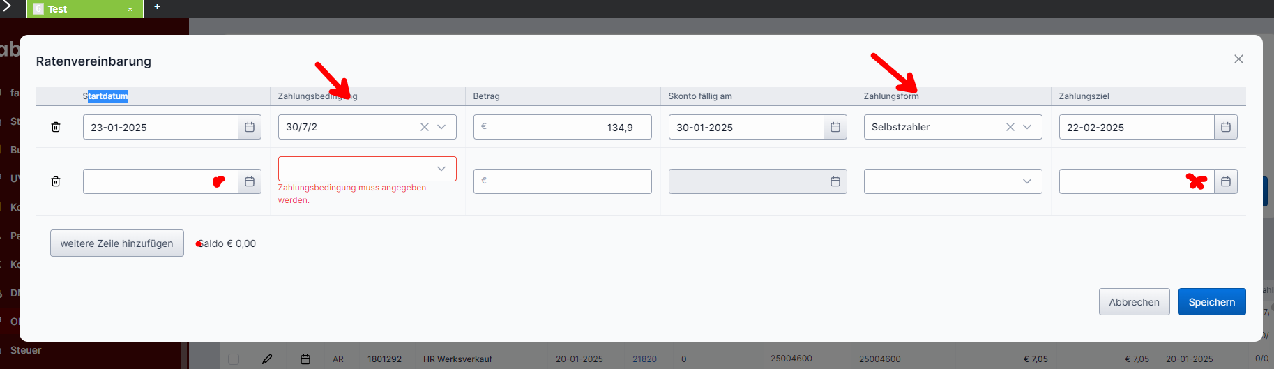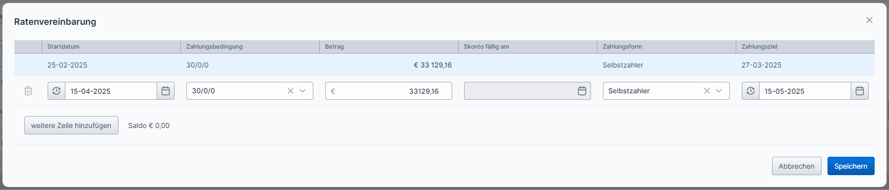1.) Kunde will in Teilzahlungen zahlen - hier wird ein Startdatum plus Zahlungskondition eingegeben und die restlichen Felder werden aufgrund dieser Angaben befüllt