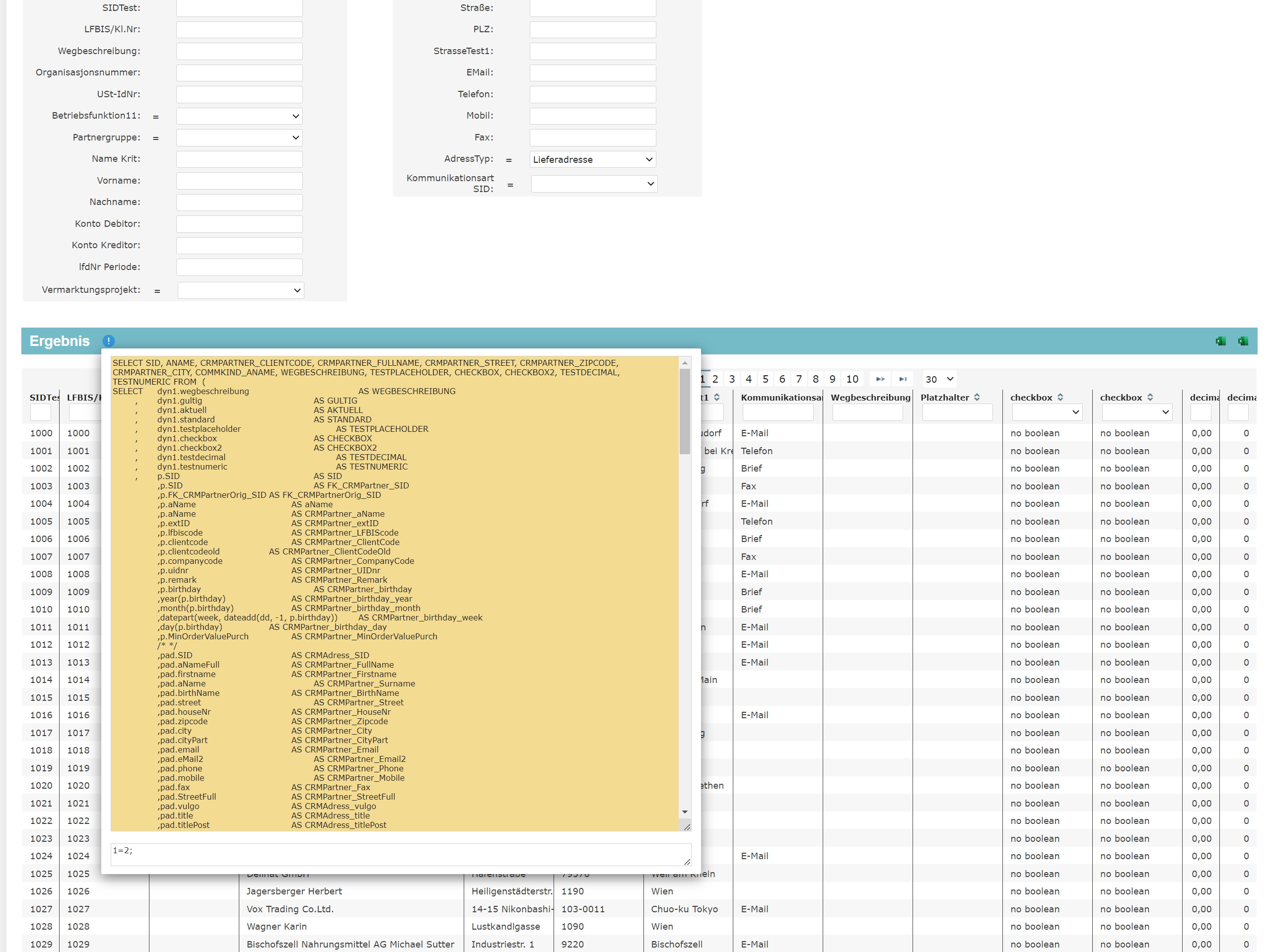 - Es ist nun möglich, auf der Suchseite einen Button zu nutzen, der ein Div öffnet und die zuletzt ausgeführte Abfrage anzeigt. Dadurch wird das Kopieren und die Analyse der Abfrage im Management Studio erheblich vereinfacht. Um diesen Button anzuzeigen, wurde eine neue Rolle eingeführt, die standardmäßig per Install-Script der Administratoren-Gruppe zugewiesen wird. Die Darstellung erfolgt ohne Ersetzung der Prepared Values. Die Rolle trägt die ID 12504 und den Namen “Suchseite: Anzeige der letzten Abfrage”.