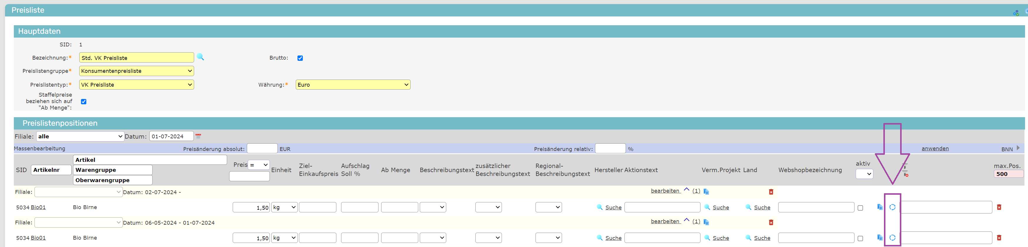 - 'Preislistenposition abschließen und Duplikat erzeugen'