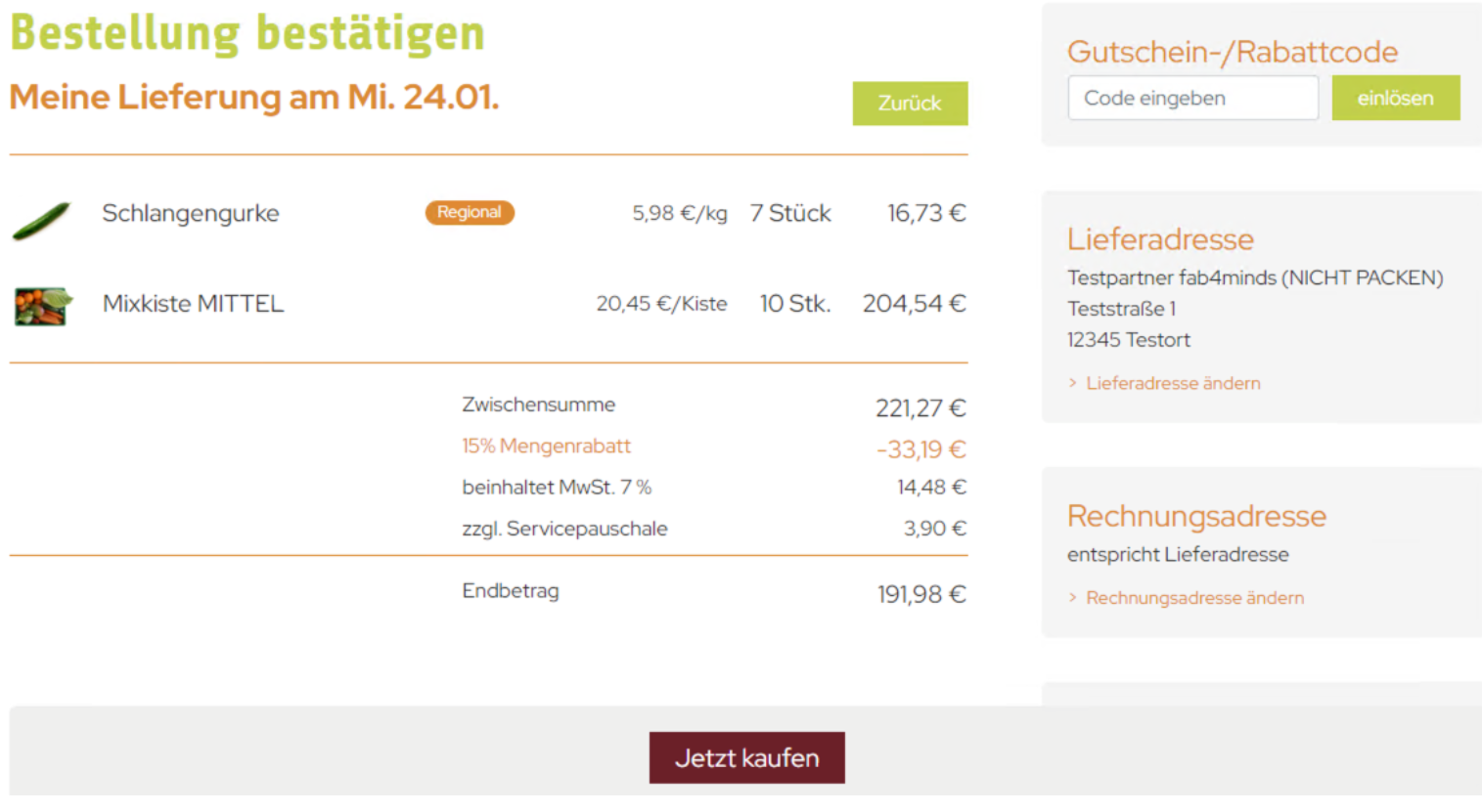 - Diese Kondition muss bei der Partnergruppe hinterlegt werden, damit diese im Webshop greift und dann z.B. folgendermaßen im Checkout angezeigt wird: