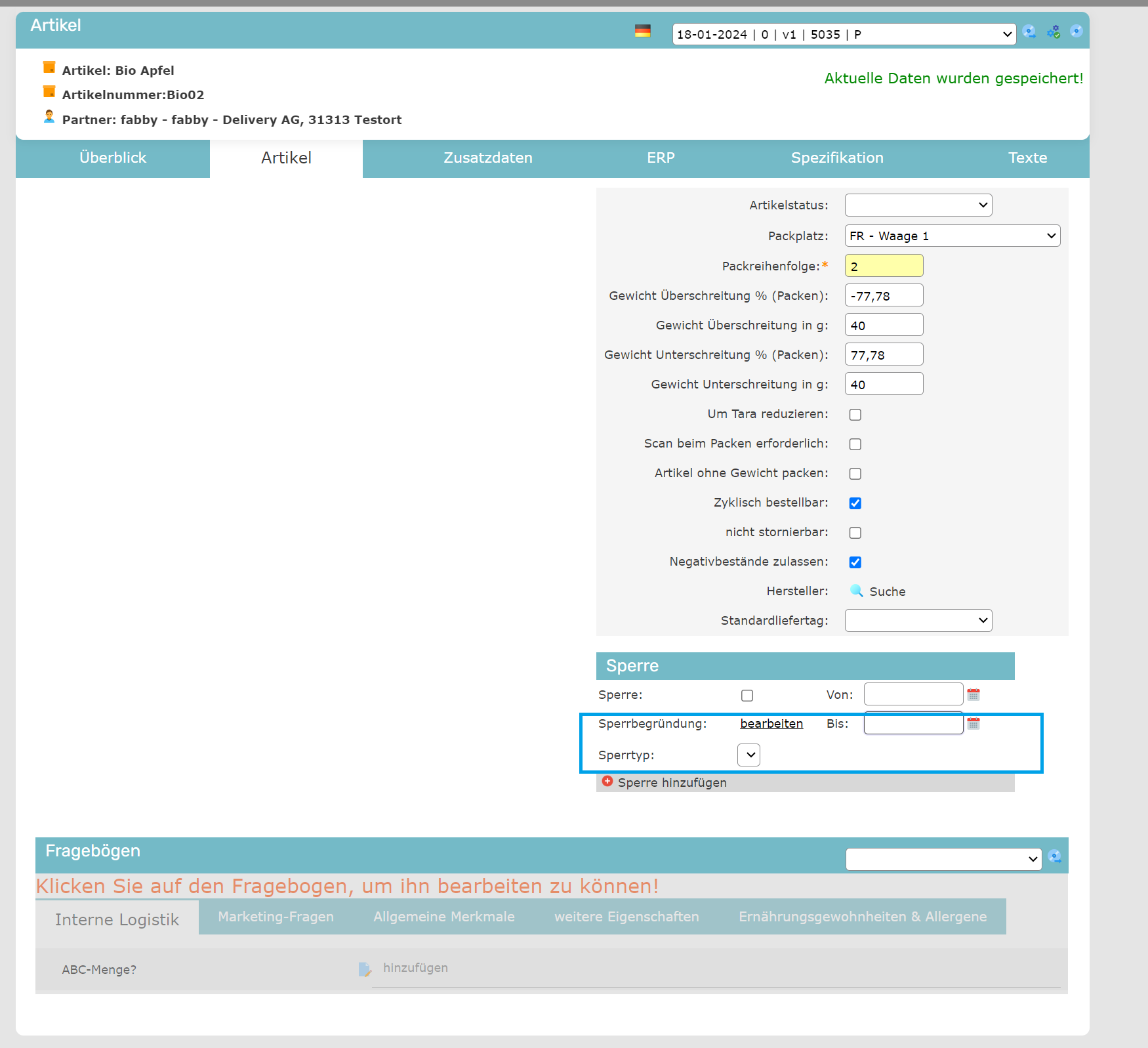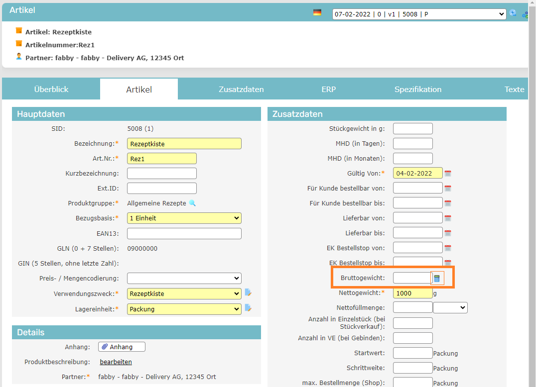 Bei Sandbox muss ggf. ein entsprechender Standardliefertag angegeben werden, damit ein gültiger Tag im Detail ausgewählt wird.