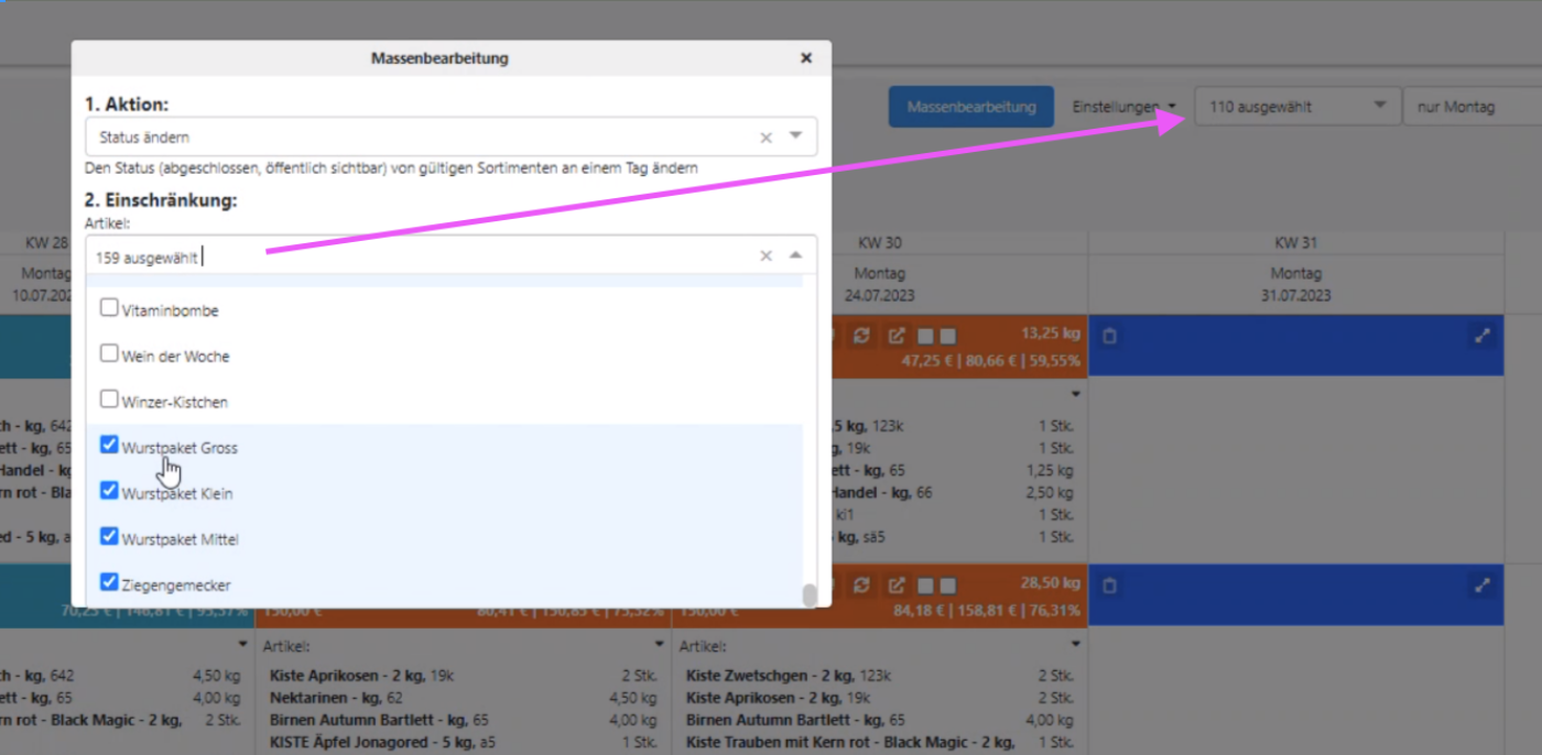 - Ab der Version 109 werden ausgeblendete Sortimente auch in der Massenbearbeitung ausgeblendet.