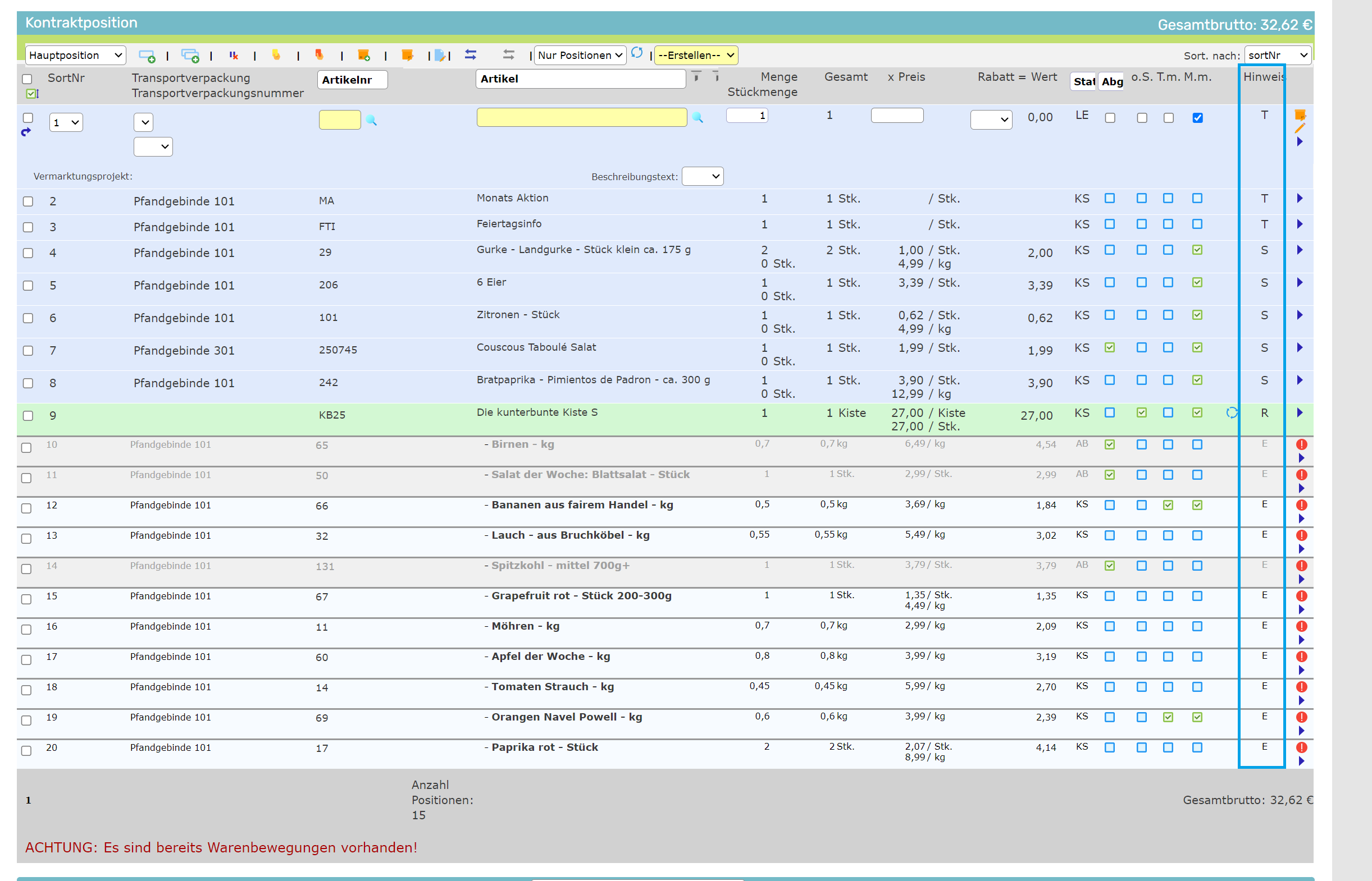 Zusätzlich gibt es pro Position eine Checkbox, mit der Artikel, die durch den Filter ausgewählt wurden, wieder ausgeschlossen werden können. Im Tabellenkopf soll zudem eine Checkbox „Alle auswählen“ integriert werden.